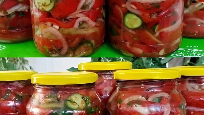 Jei mėgstate konservuoti, bet nenorite vargti, šis receptas skirtas jums. Ko jums reikės: 1 kg pomidorų; dviejų paprikų; dviejų svogūnų; česnako galvutės; prieskoninių žolelių (krapų ir bazilikų); 1 litras vandens; 4 šaukštai cukraus; 2 šaukštai druskos; 50 ml acto; prieskonių (lauro lapų, pipirų, kalendros...
