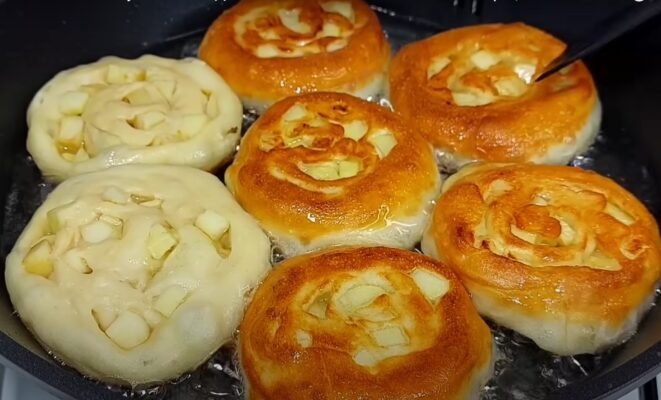 Keptuvėje kepamos kvapnios obuolių bandelės. Mano vyras jų suvalgo 10 ir nepriauga svorio.