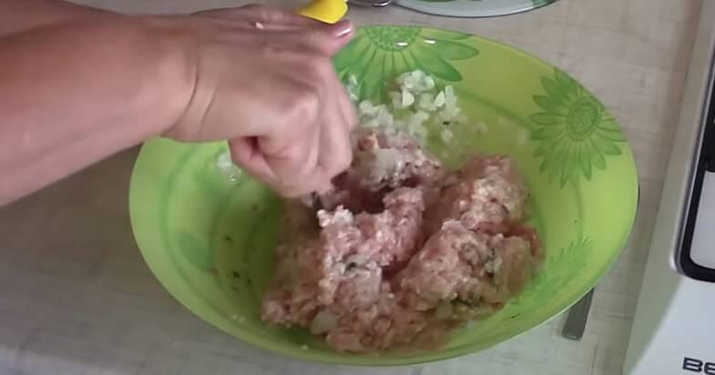 - Sumaišykite maltą mėsą su svogūnais ir žolelėmis, pagardinkite druska ir prieskoniais, gerai išmaišykite.