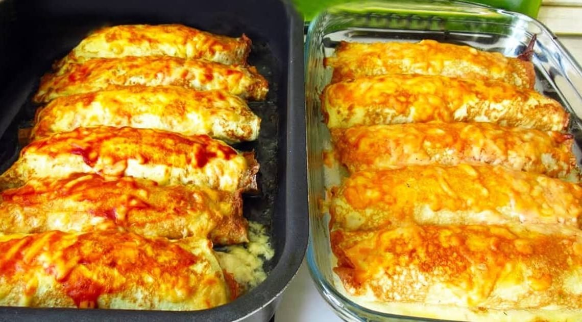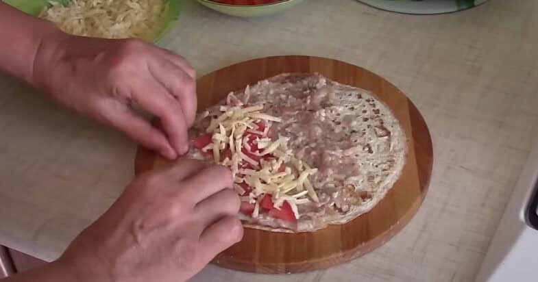 - Ant blyno dėkite sluoksnį maltos mėsos, tada – pomidorų gabalėlius ir šiek tiek tarkuoto sūrio. Suvyniokite. Paįvairinimui vietoj pomidorų galite naudoti marinuotus agurkus arba kopūstų lapus.