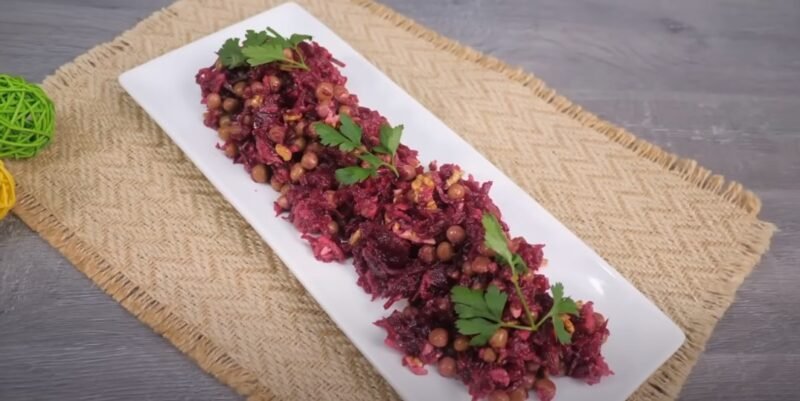 Burokėlius išvirkite ir sutarkuokite. Nuo obuolio pašalinkite žievelę ir taip pat sutarkuokite tarka. Susmulkinkite graikinius riešutus ir išsiųskite į produktus. Atidarykite žirnelių skardinę, nusausinkite skystį, o likusią dalį perkelkite į salotas. Česnaką išspauskite per presą ir sudėkite į produktus. Pasūdykite ir supilkite aliejų, gerai išmaišykite.