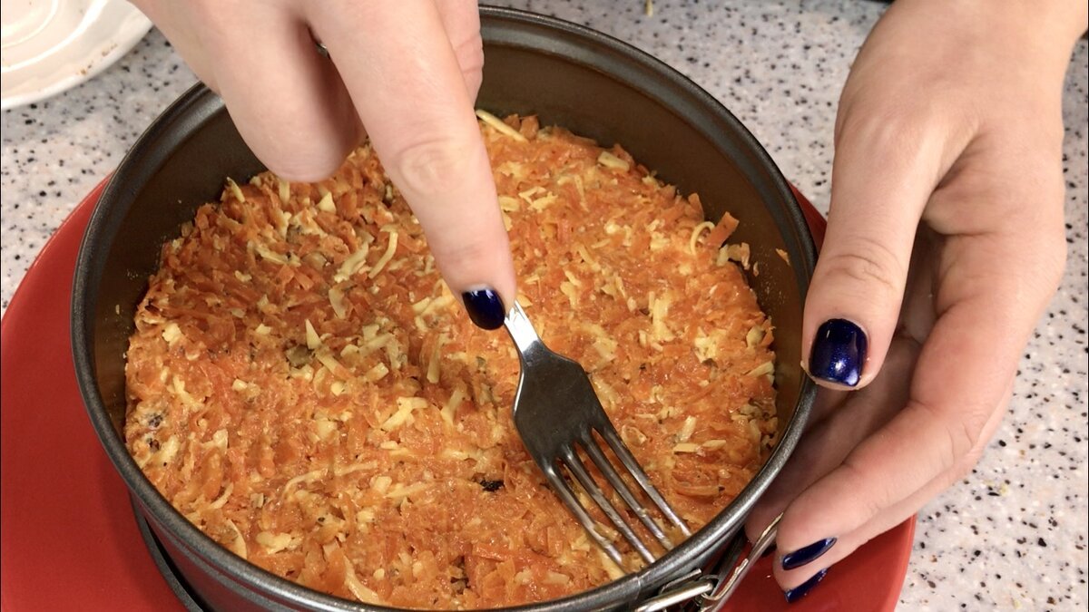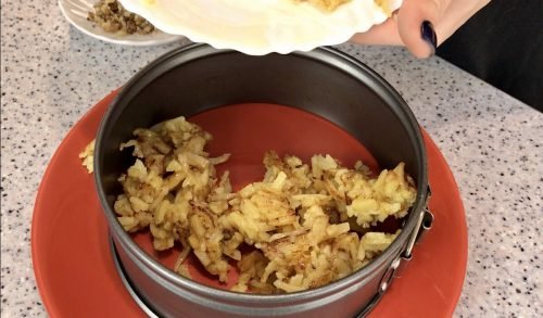 Kepkite supjaustytas bulves, kol paruduos. Paimkite 18 cm skersmens formą salotoms formuoti. Ant dugno išdėliokite bulves. Tada išvirkite morkas, jas sutarkuokite. Į jas suberkite tarkuotą sūrį ir smulkintus graikinius riešutus. Viską užpilkite 2 valgomaisiais šaukštais majonezo ir išmaišykite. Viską sudėti į antrąjį sluoksnį.