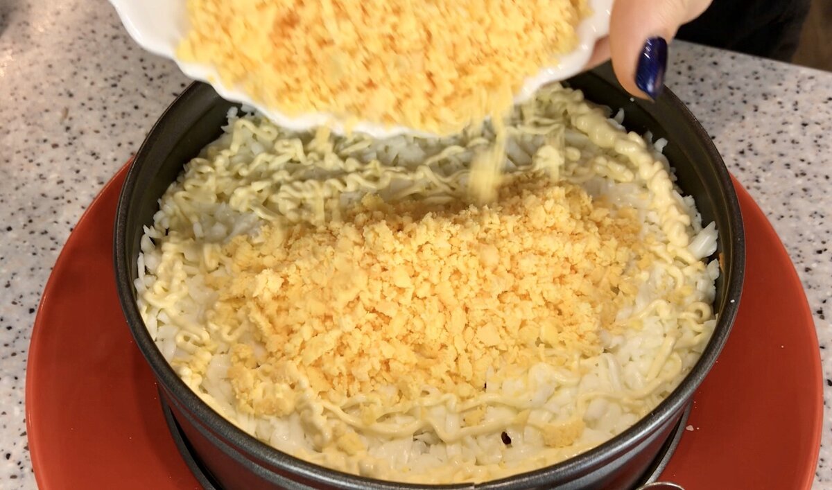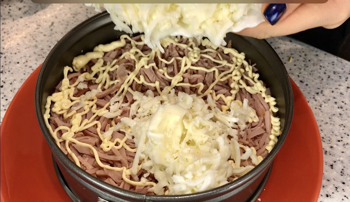 Supjaustykite kumpį plonais šiaudeliais ir uždėkite ant viršaus. Padarykite majonezo tinklelį. Sutarkuokite kiaušinio baltymą ir išdėliokite kaip naują sluoksnį. Pagardinkite druska ir uždenkite majonezo tinkleliu. Dabar supjaustykite trynius ir taip pat sudėkite ant salotų. Tai paskutinis sluoksnis. Dėkite gaminį į šaldytuvą. Jam reikia maždaug valandos, kad įsigertų.