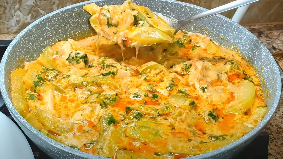 Troškintos cukinijos, vištiena grietinės padaže – puikus maistingas, bet kartu ir lengvas patiekalas. Jį galima patiekti ir pietums, ir vakarienei. Grietinė suteikia patiekalui minkštumo, lengvos rūgštelės, subtilios struktūros ir sujungia visus komponentus į vientisą masę. Po terminio apdorojimo viskas tampa minkšta, persmelkta vienas kito skonio. Duete su bulvių koše, ryžiais ar šviežia duona suteikia nepamirštamą valgymo malonumą.