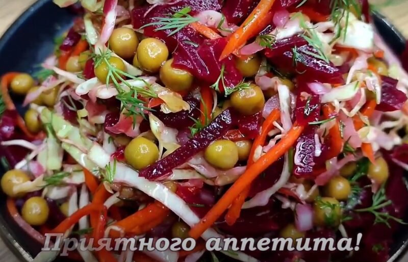 Burokėlius išvirkite, supjaustykite plonais strypeliais. Smulkiai susmulkinkite kopūstus. Perkelkite į salotinę, sudėkite morkas, žirnelius, burokėlius.