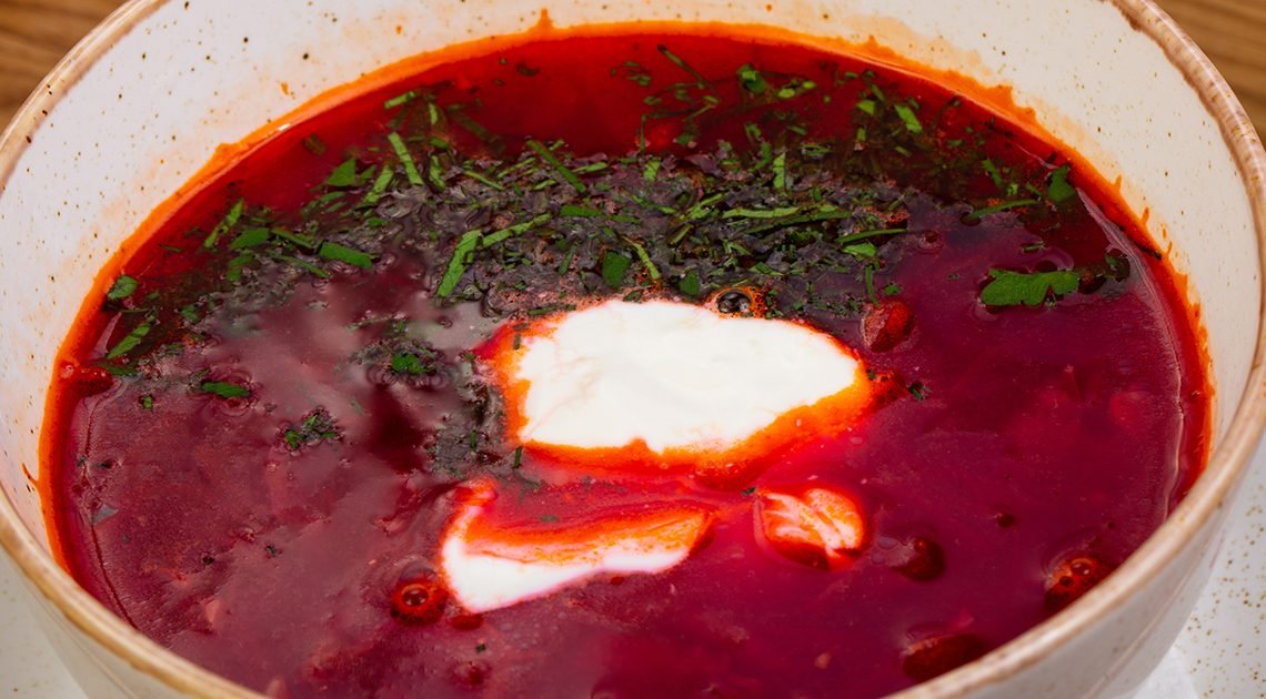 - Iš pradžių sultinys – 20 minučių, tada burokine tarka sutarkuoti burokėliai.