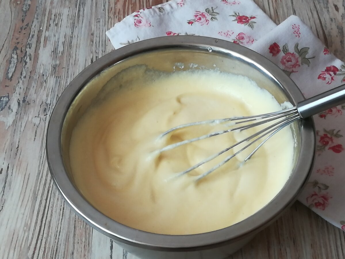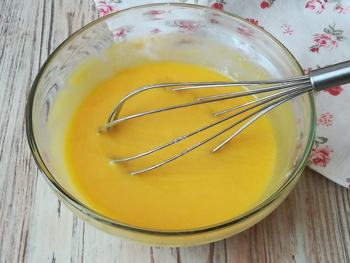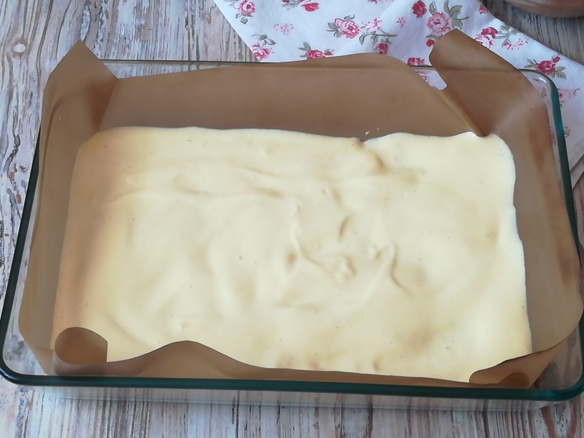 Į šį pagrindą įpilkite pieno, pusę cukraus, trynius (baltymus atskirkite iš anksto), galite įdėti šiek tiek vanilės. Viską sumaišykite mikseriu arba plaktuvu iki vientisos masės. Kol kas palikite į šalį.