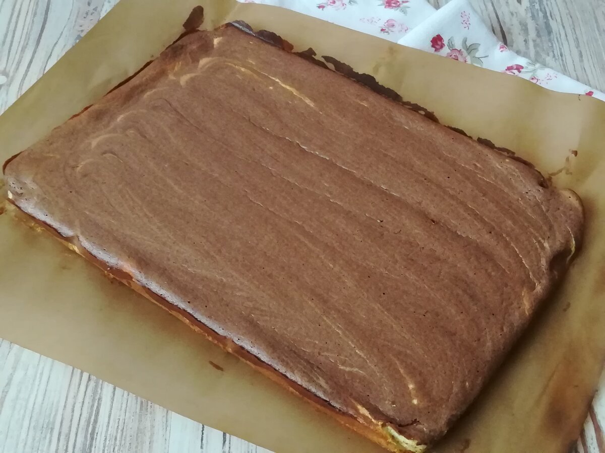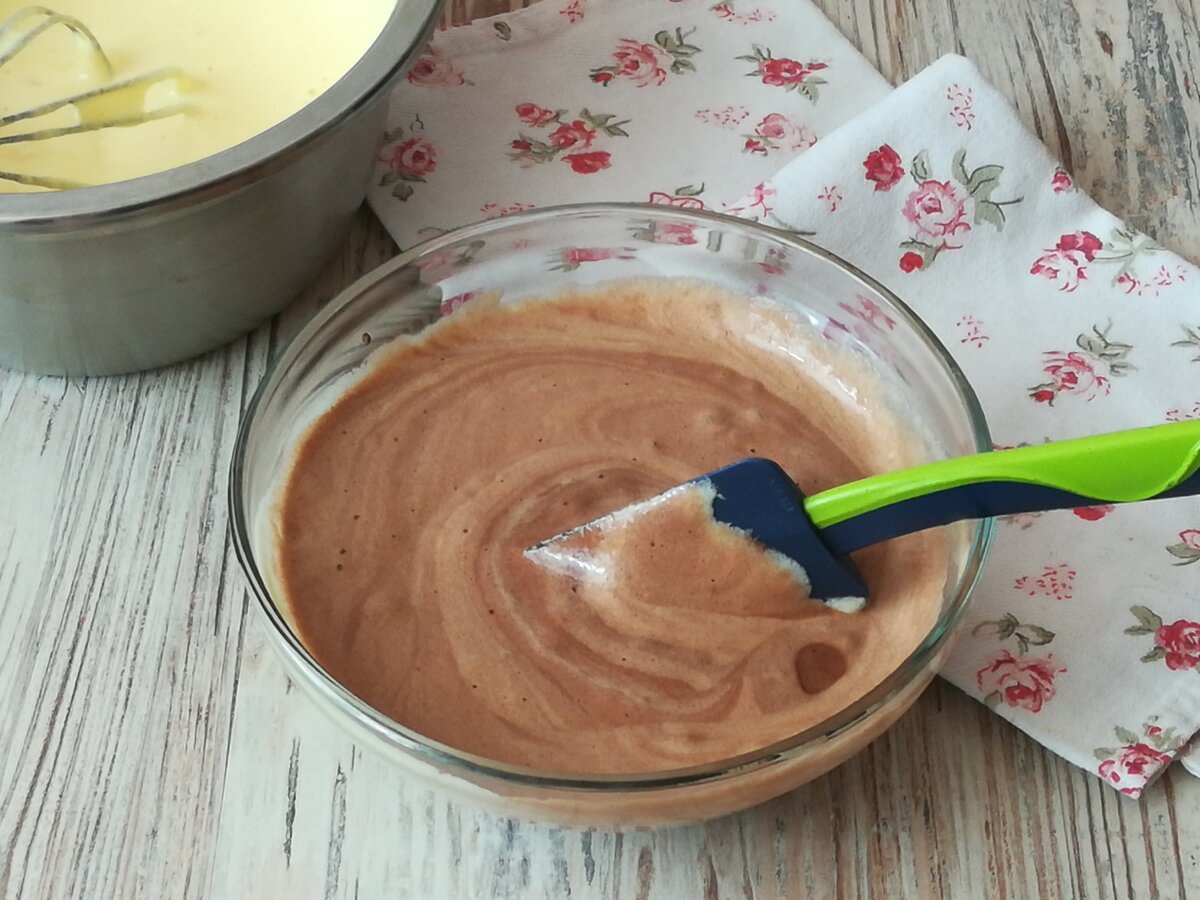 Baltymų masę sumaišykite su trynių mase – atsargiai, be staigių judesių. Gautą tešlą mintyse padalykite per pusę. Į vieną dalį įpilkite kakavos ir verdančio vandens mišinį. Kad rezultatai būtų geresni, geriau iš anksto atskiesti kakavą karštu vandeniu iki vientisos košės, o tada ją supilti į tešlą – taip ji išeis be krešulių.