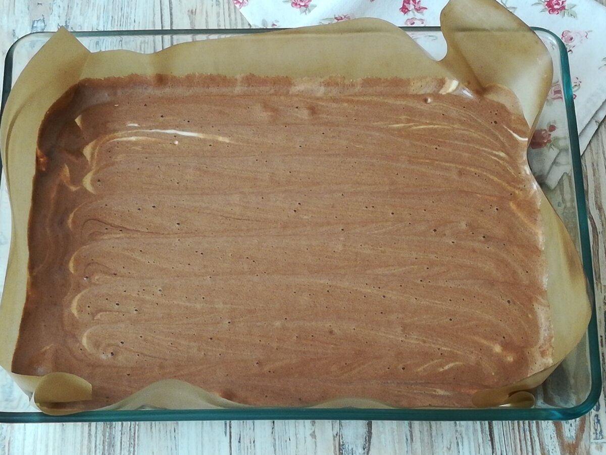 Kepimo skardą (maždaug 35×25 cm) išklokite popieriumi. Pirmiausia supilkite šviesiąją tešlos dalį.