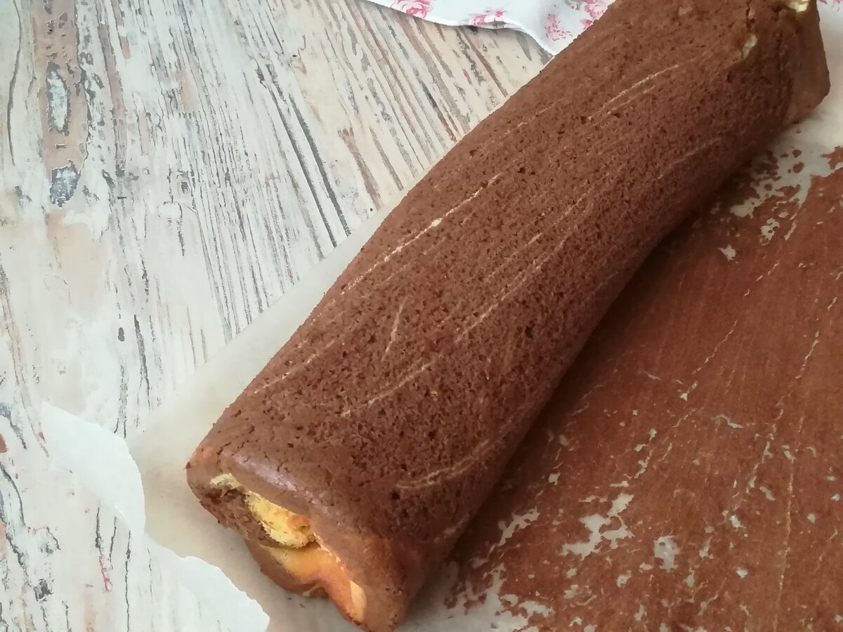 Kepkite 180 laipsnių temperatūroje 20-25 minutes. Kai biskvitas bus paruoštas, išimkite jį, apverskite plutą ant popieriaus ir iš karto, kol dar šiltas, atsargiai susukite ritinėlį – per daug nespausdami. Palikite atvėsti, kol šiek tiek sušils.