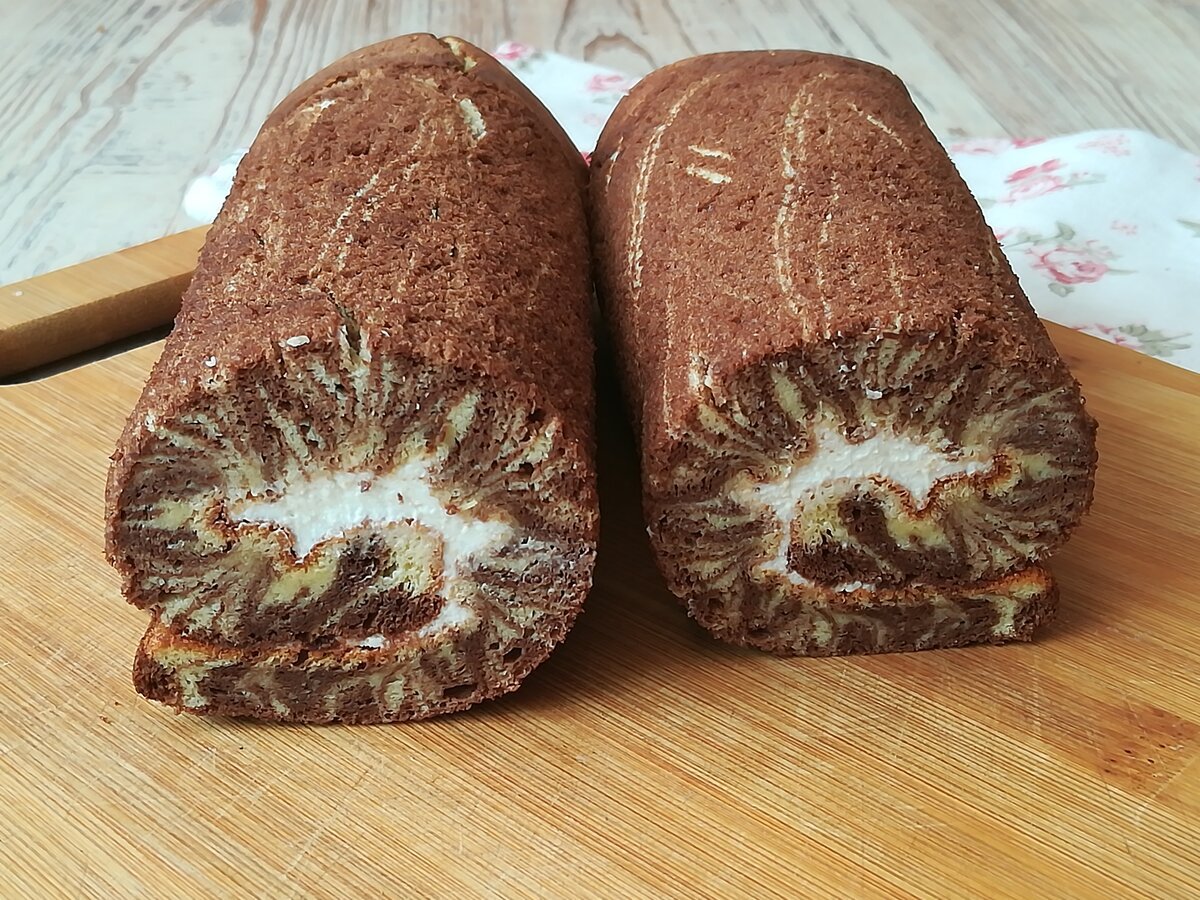 Visiškai neišvyniokite. Patepkite įdaru – uogiene, saldžia varške, varškės kremu arba plakta grietinėle su cukrumi. Vėl susukite jau su įdaru ir palikite atvėsti bent valandą. Atvėsusį supjaustykite griežinėliais. Kiekvienas gabalėlis – su unikaliu raštu. Skanėstas paruoštas, mėgaukitės.