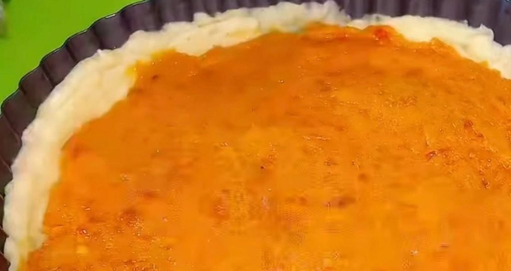 10. Sudėkite abrikosus ir uždenkite trečiąja tešlos dalimi. Aptepkite plaktu kiaušinio tryniu.