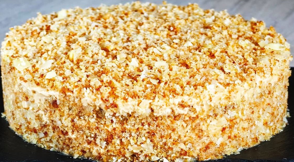 Kiekvieną sluoksnį aptepkite kremu, tuo pačiu kremu aptepkite viršų ir šonus, tada apibarstykite atraižų trupiniais.