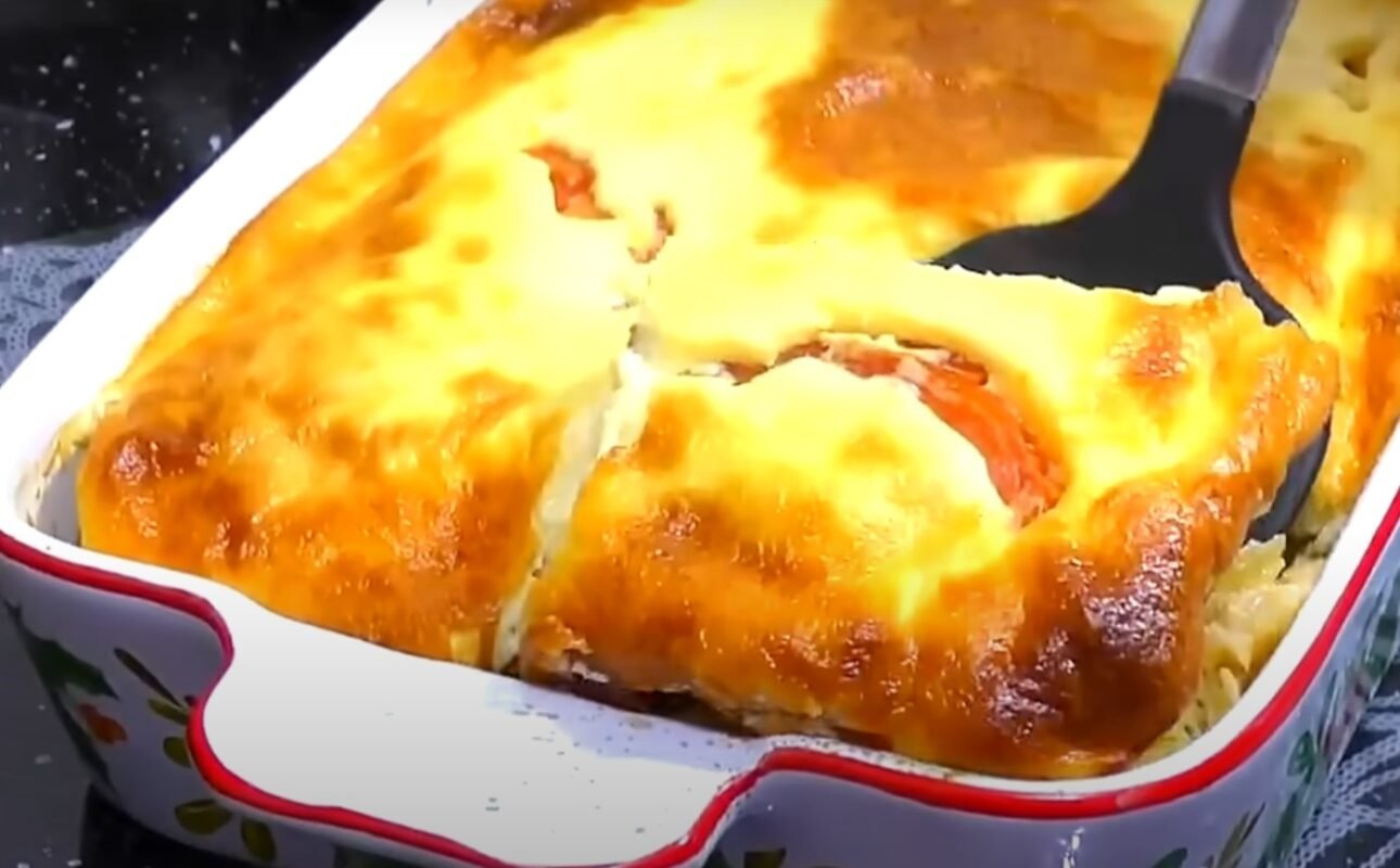 Rezultatas – skanus apkepo pyragas. Tai labai sotus pietų ar vakarienės variantas.