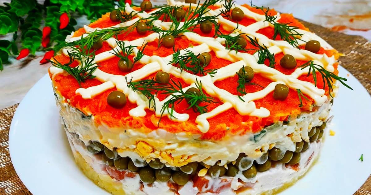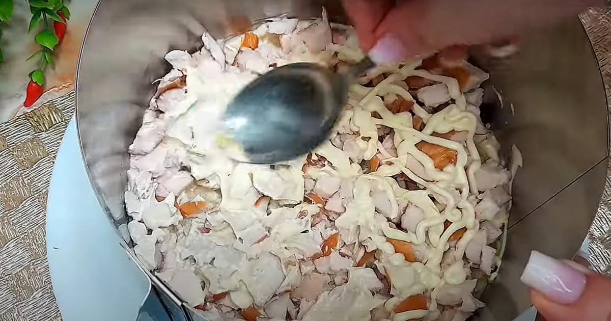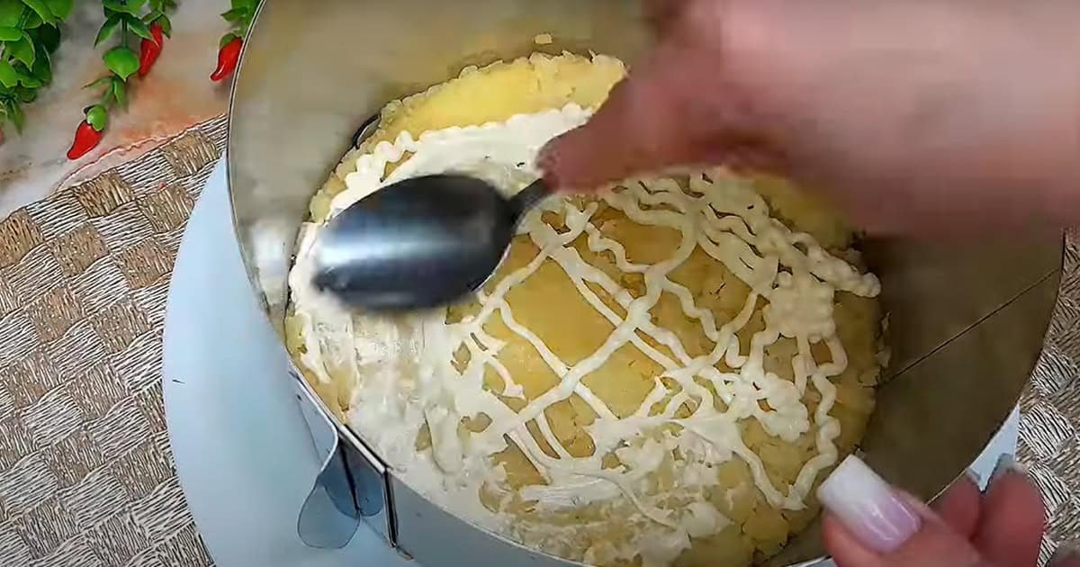 Išimamoje formoje pirmiausia sluoksniuokite stambiai tarkuotas virtas bulves. Tada šiek tiek pasūdykite ir ištepkite majonezu. Kitas sluoksnis – smulkiai supjaustyta rūkyta vištienos filė, kurią taip pat aptepkite majonezu. Ant viršaus – konservuotų žirnelių sluoksnis ir vėl šiek tiek majonezo.