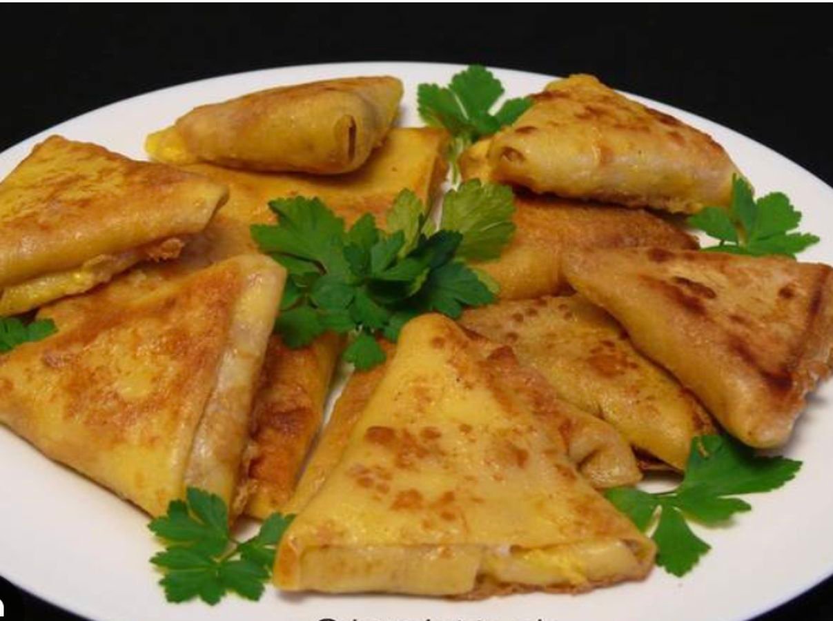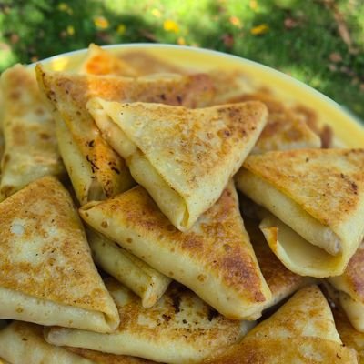 Į faršą įberkite druskos ir pipirų. Iš tešlos kepkite plonus blynelius, keptuvę patepdami sviestu (arba taukais). Kai blyneliai iškeps, perpjaukite juos per pusę. Paskirstykite įdarą ir sulenkite į trikampį, kaip nurodyta nuotraukoje.