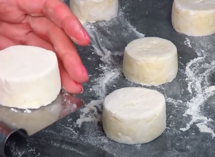 - Mišinį padalykite į 9 lygias dalis, suformuokite apskritimus. Kiekvieną jų apvoliokite miltuose. Kad forma būtų tiksli, įdėkite ruošinį į stiklinę ir padarykite kelis judesius ratu.