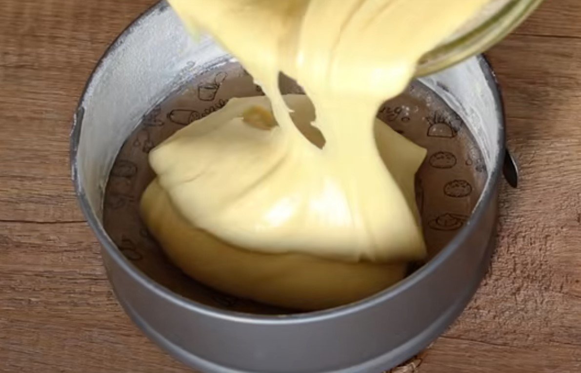 Giliame dubenyje maišytuvu sumaišykite kiaušinius ir cukrų. Turėtų gautis gražios putos. Tam reikia dirbti 3-4 minutes. Į gautą masę supilkite augalinį aliejų ir viską išmaišykite. Supilkite grietinę, toliau maišydami. Persijokite pusę miltų ir kepimo miltelius, išminkykite tirštą tešlą.