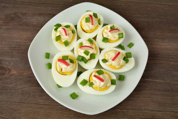 7. Išdėliokite žalių svogūnų plunksneles lėkštėje taip, kad susidarytų „tulpės” kotelis. Įdarytus kiaušinius dėkite kaip pumpurus. Papuoškite lėkštę petražolių lapeliais.