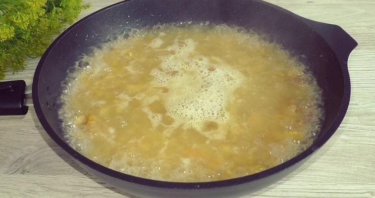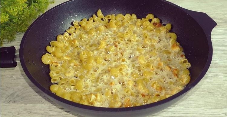 Į keptuvę įdėkite gabalėlį sviesto – apie 20 g – ir pastatykite ant ugnies. Kai tik jis pradeda tirpti, supilu sausus makaronus. Kepu juos ant stiprios ugnies nuolat maišydama 1-2 minutes, kol jie paruduoja.