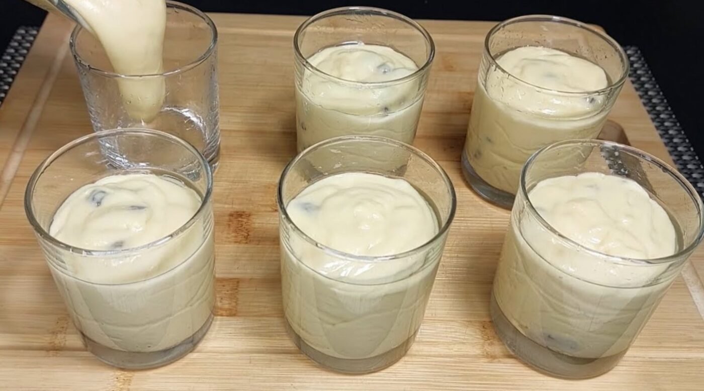 Į stiklines paskirstykite ⅔ tešlos, stiklines sudėkite ant pergamentu išklotos kepimo skardos.