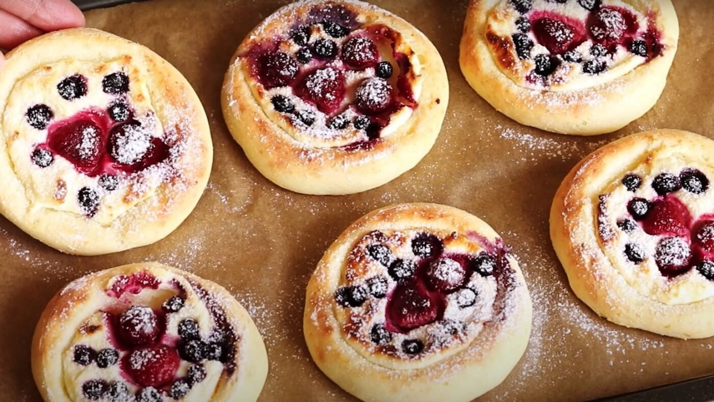 Iškepusius vatruškius galima apibarstyti cukraus pudra. Gausite saldžius, minkštus vatrushki su uogomis.