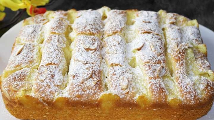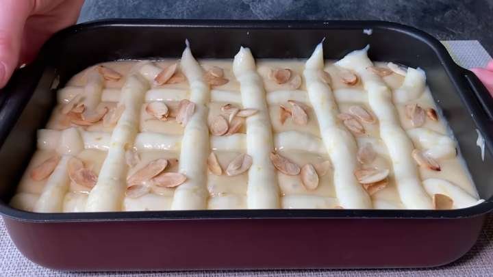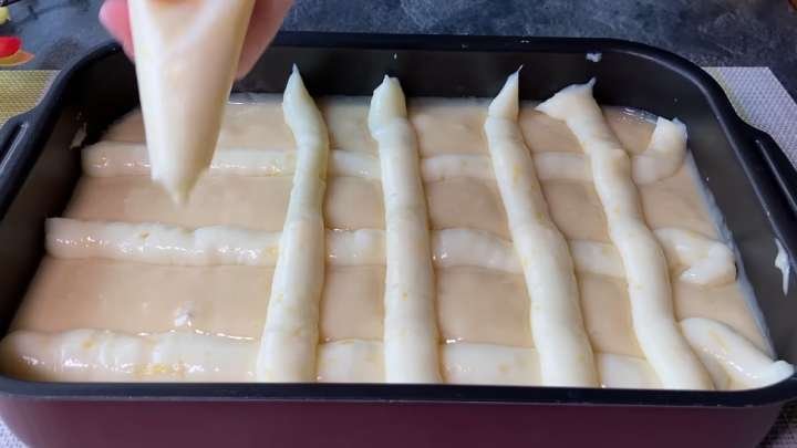 Supilkite tešlą į formą, išlyginkite paviršių mentele. Kad būtų patogiau, atvėsusį kremą perkelkite į konditerinį maišelį ir išspauskite jį grotelių forma ant tešlos viršaus. Jei norite, pabarstykite viršų migdolų žiedlapiais arba riešutais.