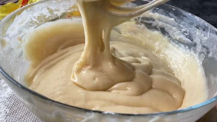 Tešlai išplakite kiaušinius su cukrumi ir vaniliniu cukrumi. Sudėkite grietinę, augalinį aliejų, kepimo miltelius, persijotus miltus ir išmaišykite iki vientisos masės.